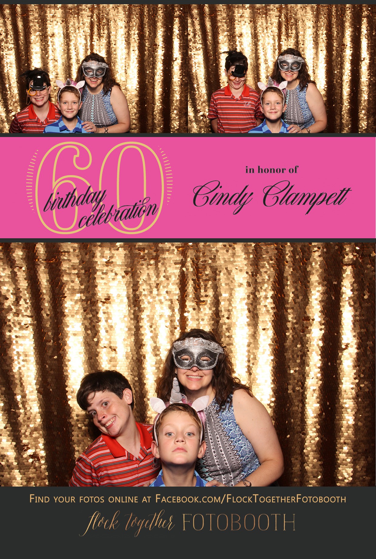 Birthday party guests in an open air photo booth with a gold sequin backdrop at a birthday party at the Hilton Lincoln Center in Dallas, Texas