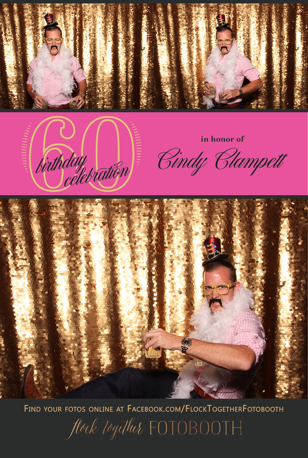 Birthday party guests in an open air photo booth with a gold sequin backdrop at a birthday party at the Hilton Lincoln Center in Dallas, Texas