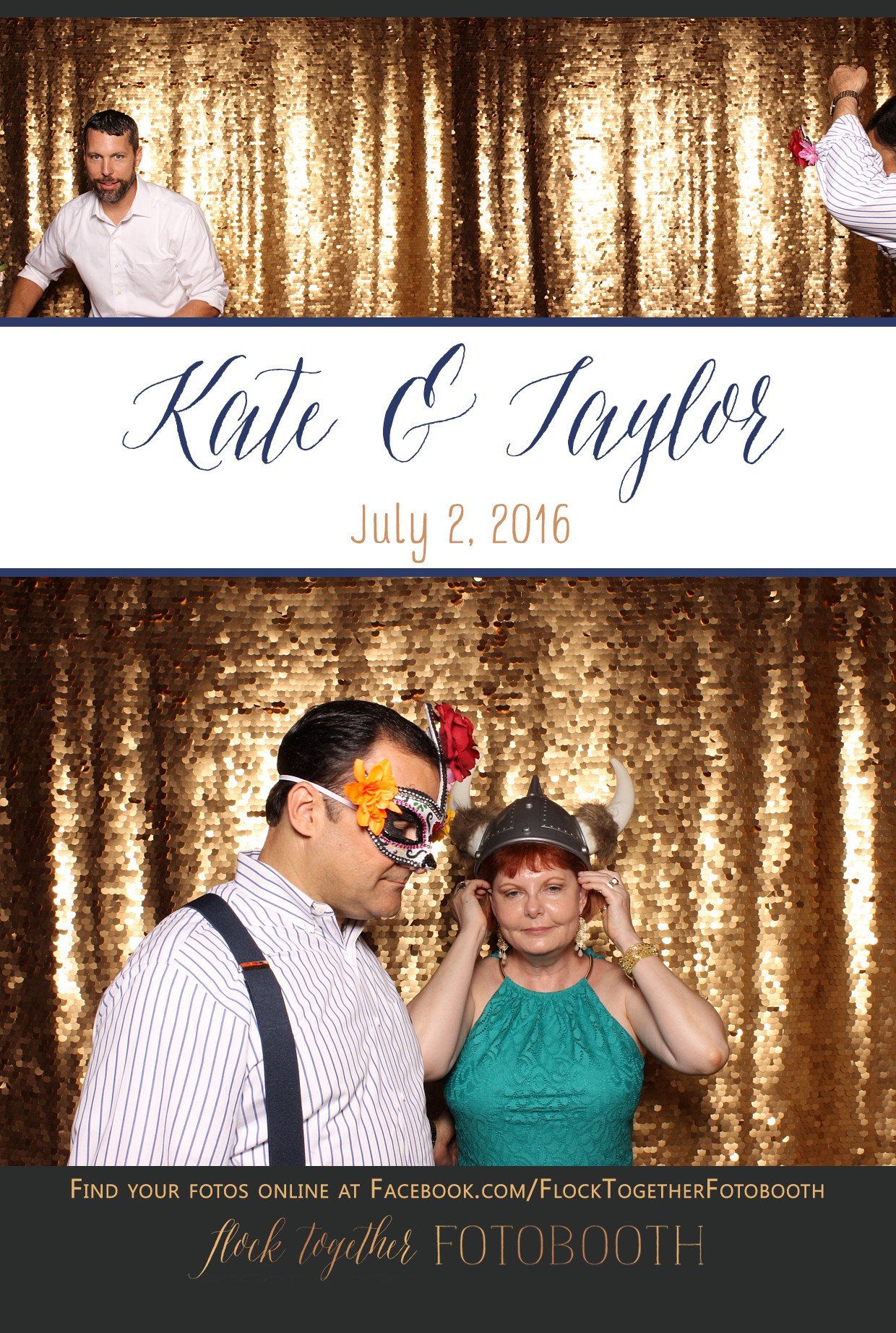 Wedding guests in an open air photo booth with a gold sequin backdrop at a wedding at The Springs venue in McKinney, Texas. Flock Together Fotobooth.