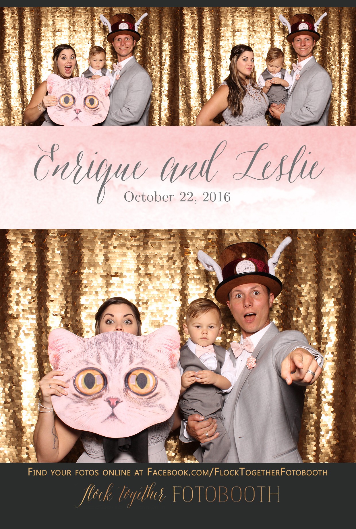 Wedding guests in an open air photo booth with a gold sequin backdrop at a wedding at The Tower Club in Dallas, Texas. Flock Together Fotobooth.