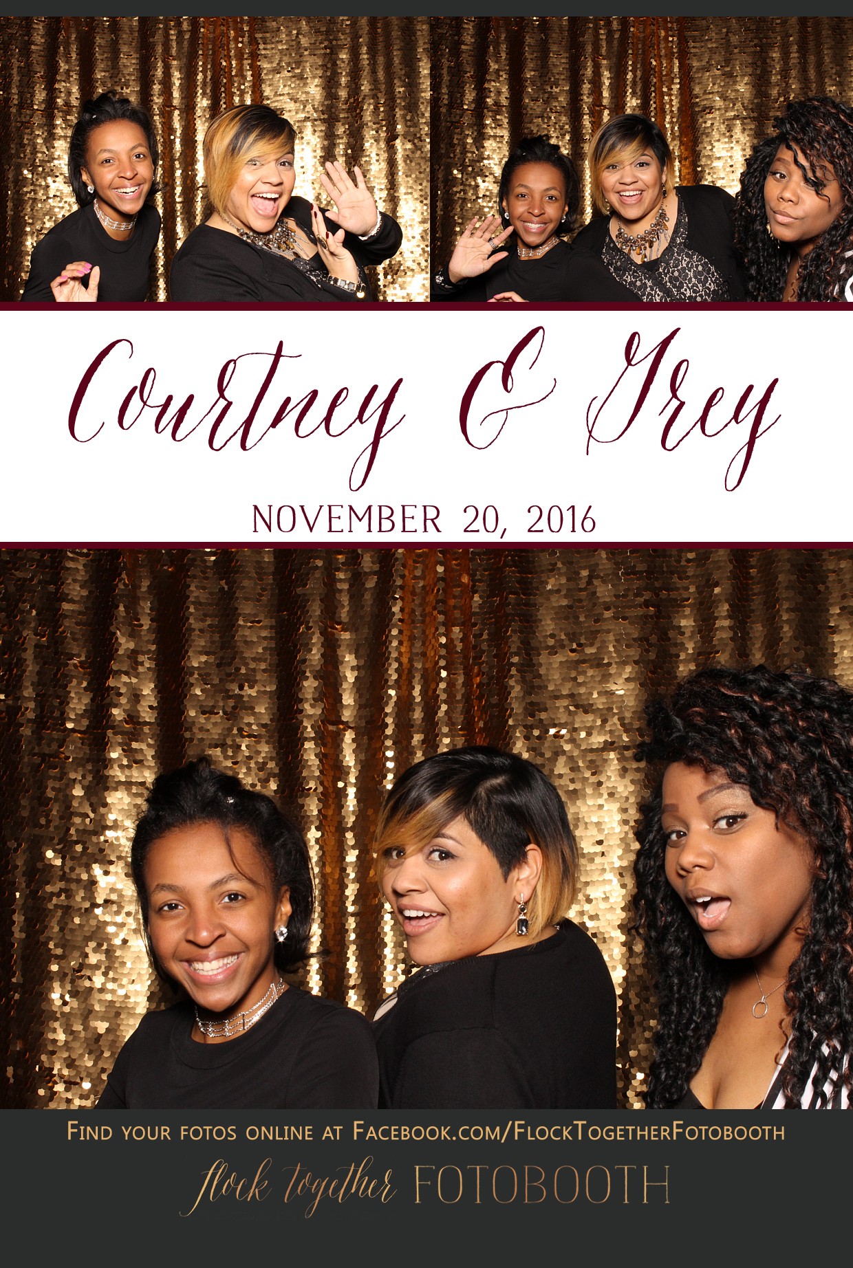Wedding guests in an open air photo booth with a gold sequin backdrop at a wedding at the The Orchard in Azle, Texas