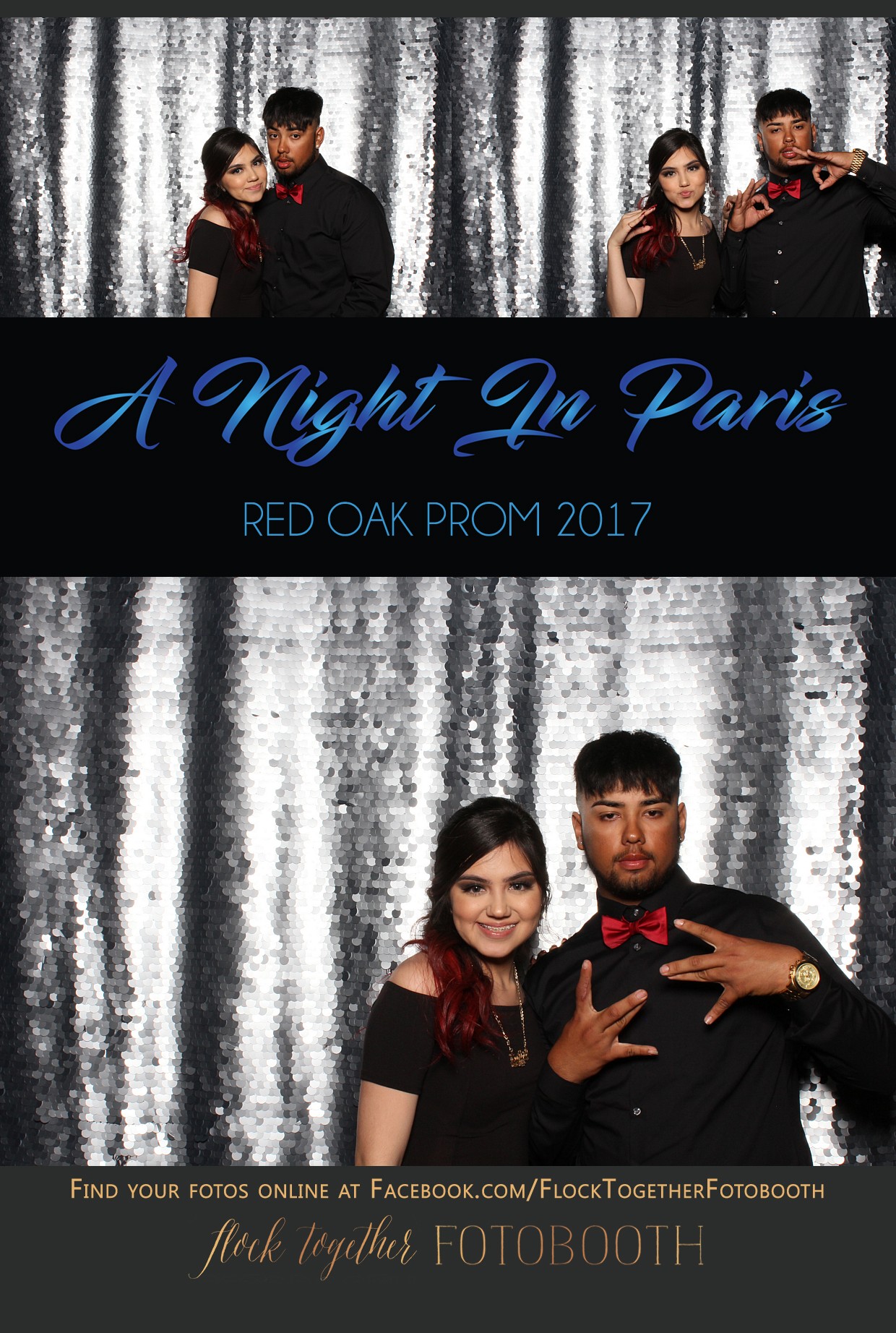 Teenagers in a prom photo booth in Dallas Texas with a silver sequin backdrop