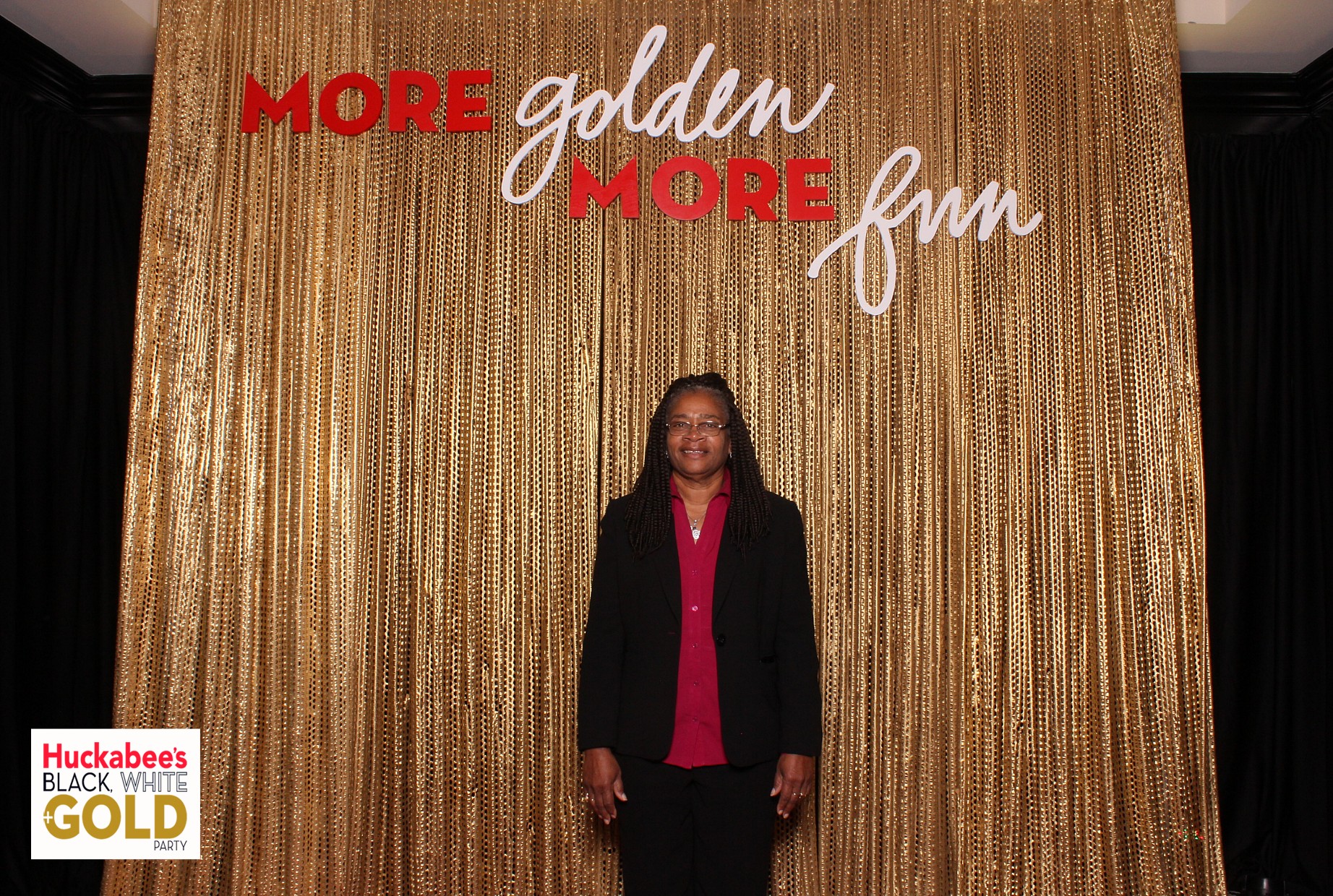 Guests in an open air photo booth with a gold backdrop at a corporate party at Hotel Zaza in Dallas, Texas